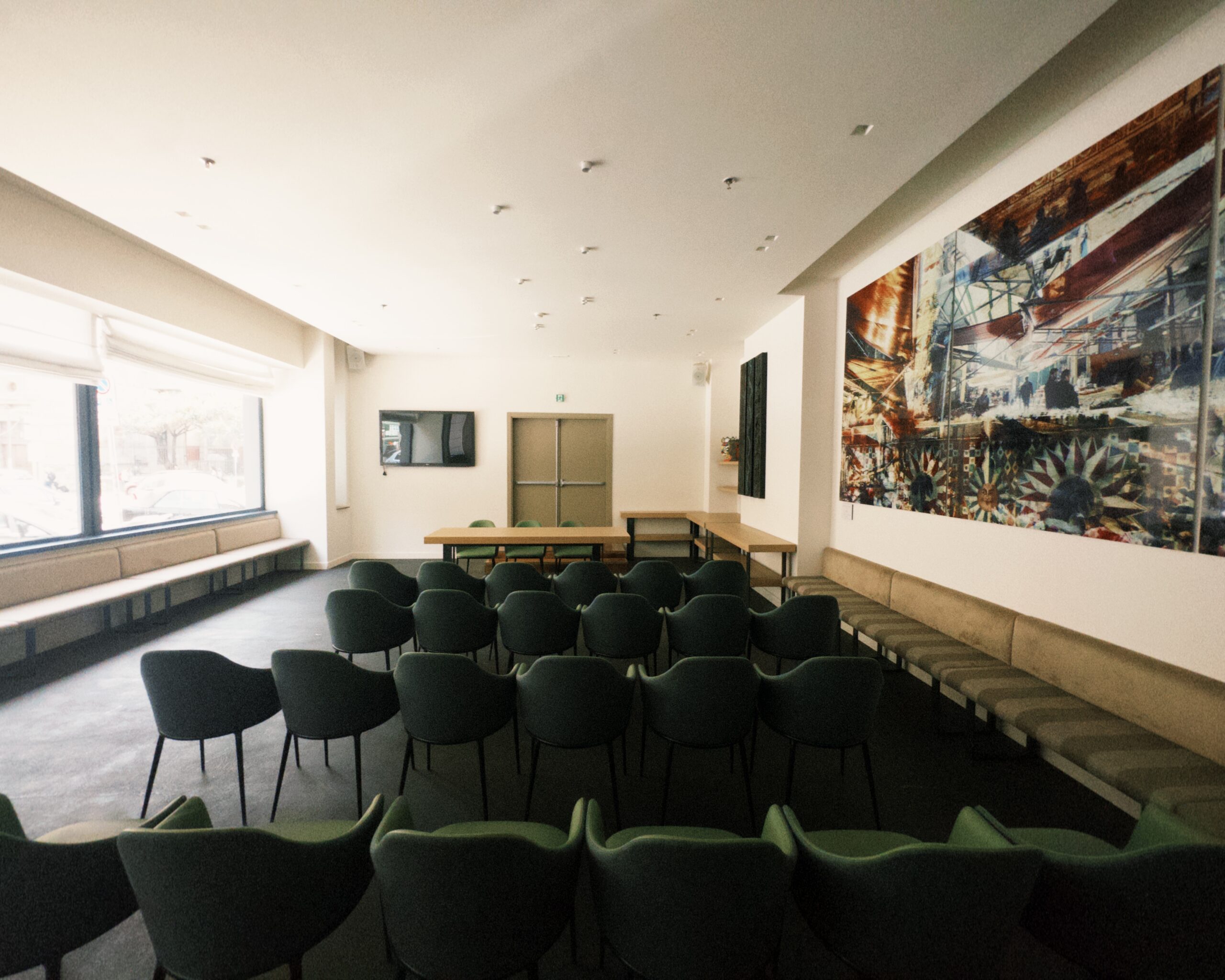 Attrezzature tecniche: schermo 62 pollici fisso a parete con collegamento HDMI, impianto amplificazione sonora, WiFi, flipchart